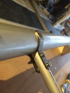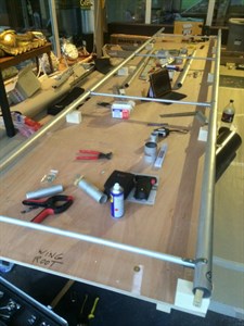 OK, what did i do to make that the assembly would have been very quick. I placed the spar tubes on blocks, because the supports also are fixed to the bottom of the tube. Small wooden parts are used as stops. Lining up the tubes is now super easy. Placing the parts that hold the connection tubes between the spars is no problem. Then you simply slide the tubes between the supports at both sides, line up and ...drill by hand. Just make sure that the tube doesn't slide while drilling.