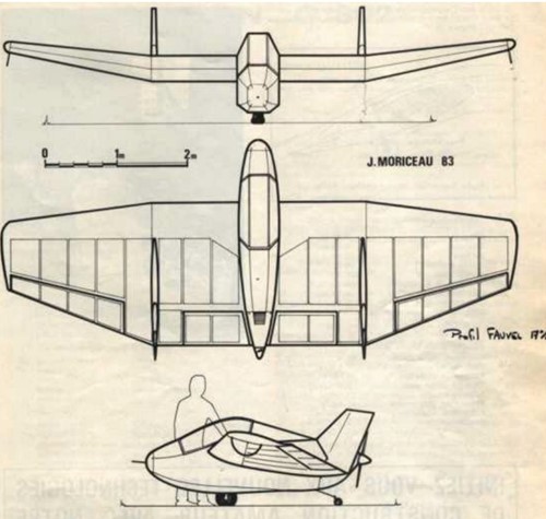 Some will say that it looks like a Fauvel AV-36. Indeed it does. But all flying planks with two rudders would look about the same. The AV-36 is intended to soar. It needs a good glide ratio. Long, heavy wings. But as you know. Long wings lead to weight and Jean-Claude wanted to reduce weight for his goal of climb rate. So ... looks like a AV-36, but with shorter wings.