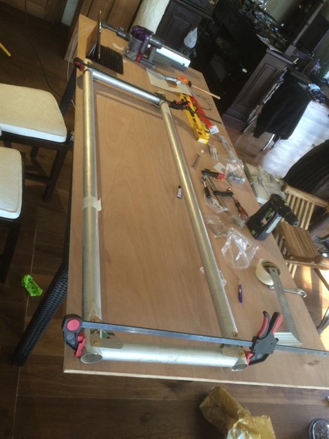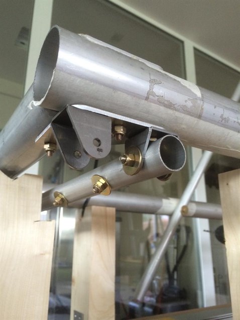 Ok, so i started connecting again. Had to puzzle how the second pair of vertical tubes were placed. Labeled one RIGHT. Drilled the third pair of vertical tubes. I need to remake one tube. Left tube had not the same distance at the bottom to the second pair. So ...i installed the connecting plate at the right side. Was super easy. I used the plate as drilling template at one side. Drilled all four holes at that side only. I drilled a single hole through the tube and installed a bolt to hold both plates. Positioned the outerplate using those other holes, lined up both plates and drilled the holes at the inner plate. Three more bolts. Done. Easy!