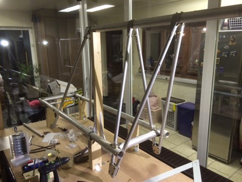 How did i do it this time? Well, i first started with trying to note where i wanted that side plate to be at the left side. I used a angle tool to draw a line on the edge of the table. Then i used that big angle tool to draw that line across the table. At the other side i could use small angle tool to position the side plate in longitudal axis. Now i needed to know the height of the plate. Simply measured at the other side. With these both dimensions i placed the plate and lined it nicely vertical like at the other side. I drilled again the holes at one side, but this time only in the second vertical tube. Now i placed the third vertical tube so it was on the right spot for this side plate. I haven't drilled the connecting hole yet at the frame main tube. That will be the last hole in this process.