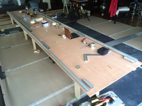 OK, what did i do to make that the assembly would have been very quick. I placed the spar tubes on blocks, because the supports also are fixed to the bottom of the tube. Small wooden parts are used as stops. Lining up the tubes is now super easy. Placing the parts that hold the connection tubes between the spars is no problem. Then you simply slide the tubes between the supports at both sides, line up and ...drill by hand. Just make sure that the tube doesn't slide while drilling.