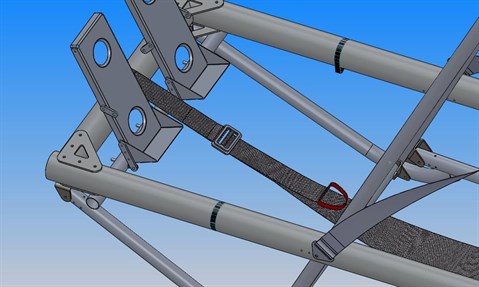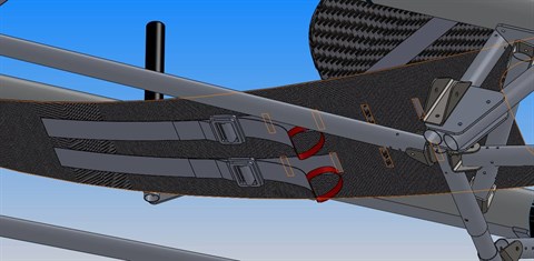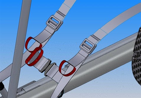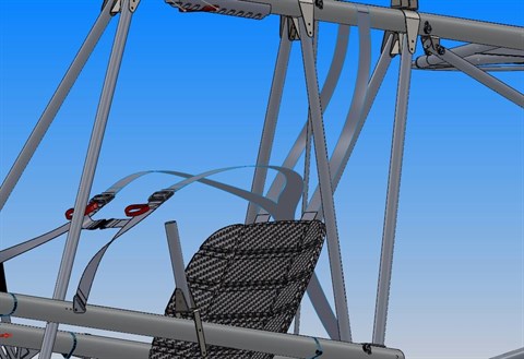 This shows how we give the pilot more slack in the seat to be able to get his torso upright during a footlaunch and also his position a bit more backwards. During standing up he needs this more backwards position because most of the weight of the glider is behind him. If he can decrease the distance between his shoulders and the center of gravity of the glider he will have less effort keeping the glider in the perfect launch position on the start ramp.