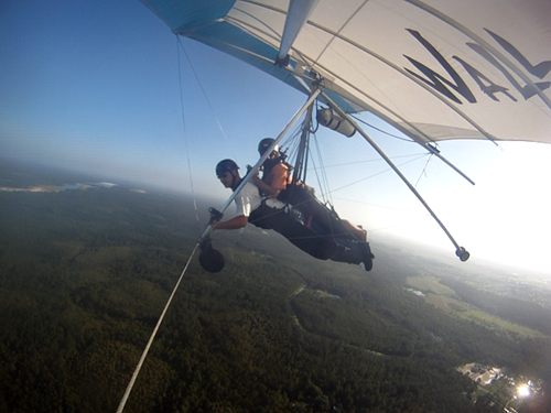I encountered Tom Haagdorens of Trike Valley in Belgium. He uses a winch system to pull up the hanggliders. Super easy and super fun as well. You have not the instructor next to you, but Tom guides you by radio. You start very low over the ground and Tom increases the height of his pull up as your experience increases.