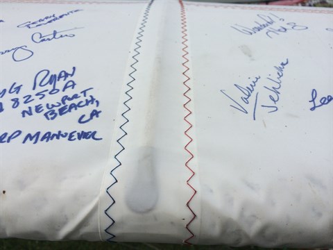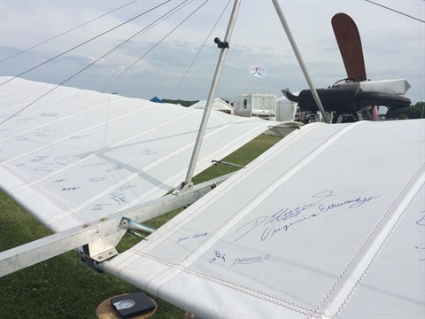 You might have noticed that the fabric is filled with writing. Lee Fisher asked the visitors of Airventure 2015 to sign his wings. There are some remarkable signatures between them. One of Bob Hoover. And one of a family member of Santos Dumont.