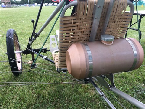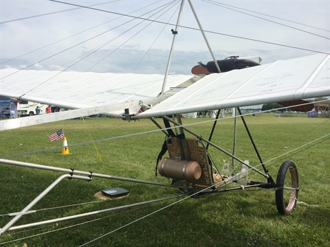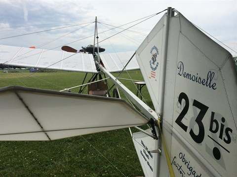Lee Fisher lives near Oshkosh. He made this ultralight airplane based on a ... But he changed it so dramaticly you can speak of a new design. He gave it the name "23 Bis, the airplane that never flew". With this he refers to the work of Santos Dumont, the pioneer. He never make a model 23. Well, if he would have had access to modern materials he would have had built something like this, Lee Fisher says.