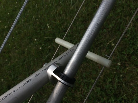 That same pitch control tube is supported halfway by this sliding support. Lee can really make a lot of things with his CNC machines. Below you see a white plastic tube being used to guide the cables towards the rudder. Also very light and very simple.