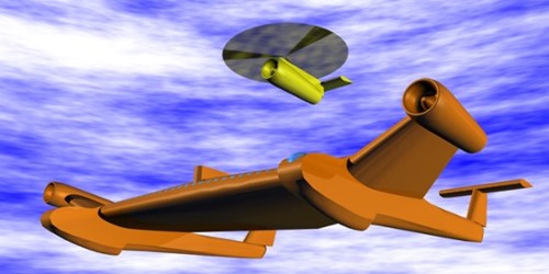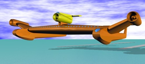 I think that the slipwing should be a landplane with a large wing area and a strong power plant, which produces less noise. I was thinking about ducted fans. It has the advantage that there are no rotating parts on the outside. So there should not be a problem during disconnection. Ducted fans have the advantage that the prop can be smaller than on open propellers. This can lead to compact slipwings on the back on a seaplane. Ducted fans have the disadvantage that they should be operated in a small speed range. This is not a disadvantage in this concept. The slipwing takes off with the seaplane, disconnects and lands as soon as possible. It has not the chance to gain higher speed. [Editor (Koen)]: As you can see in the pictures, I changed me mind a bit about this. I made the slipwing into a gyrocopter. Why? Just adding power for take-off from the water, not adding wingarea. I guess it will be a bit too much drag if I would do that.