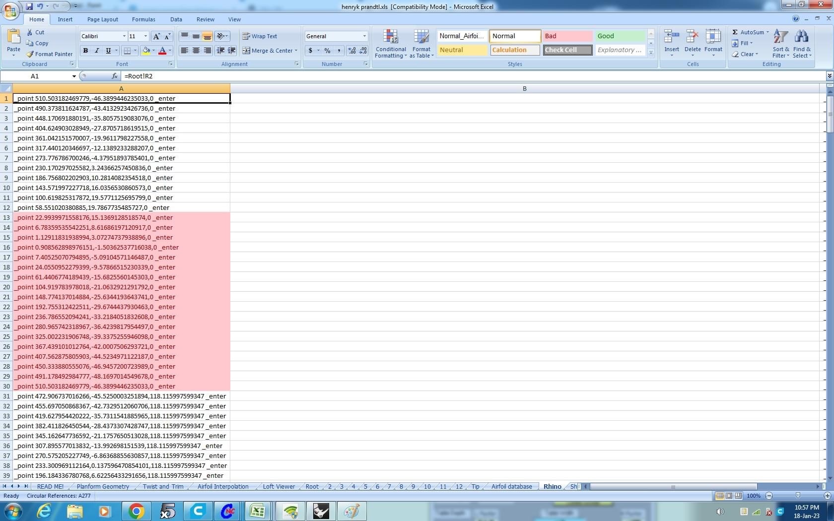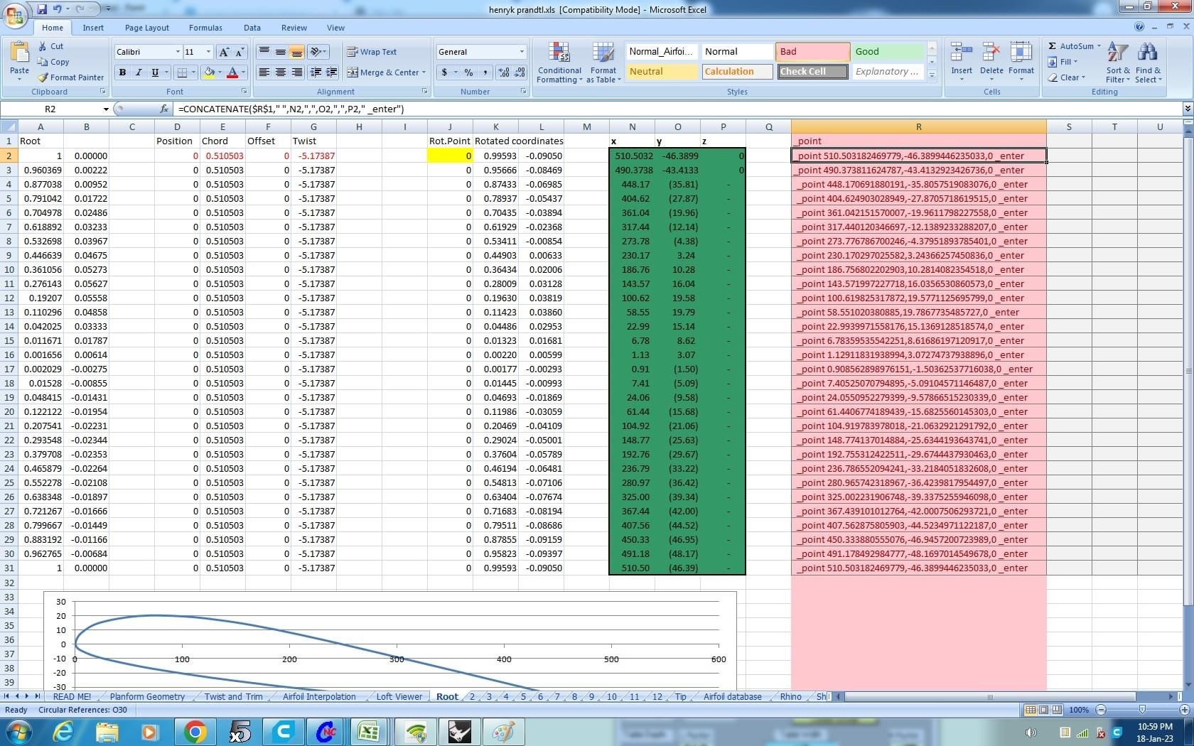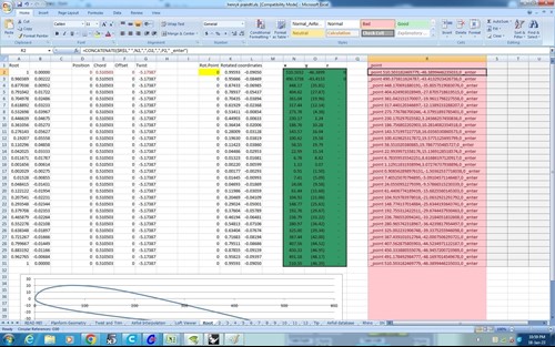 I used =CONCATENATE to produce a Rhino input marco string for each foil station. See picture below. I then created a new TAB to combine the foils as a large marco to be copied and pasted directly into the Rhino Command line. Final picture shows the foils in Rhino."