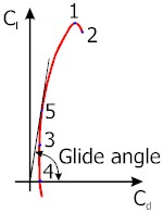 Now let's look at the curve. Point 1 indicated the stall. It is further away to the right related to airplanes with a higher aspect ratio. So the line drawn from the point (0,0) to this point makes a larger angle in relation to a vertical. This means that the low aspect ratio can fly with higher glide angles and still be controllable. And that can be handy during landings.