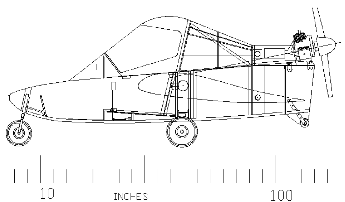 Note by Mike: I was proposing to fit a Cri Cri canopy originally, but couldn’t locate one, so the next scheme shows the home-made canopy. Final configuration has a composite fuselage, built up from 25 mm urethane foam with fiberglass skins and wooden load points. The engine was a borrowed Konig SC430. Note the thrust line is angled to meet the criterion in Backstrom’s article. There is no noticeable pitch change with change of power.
