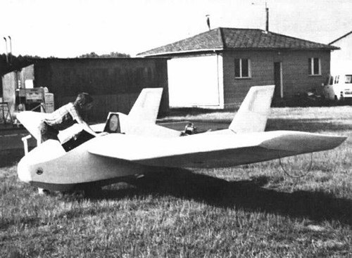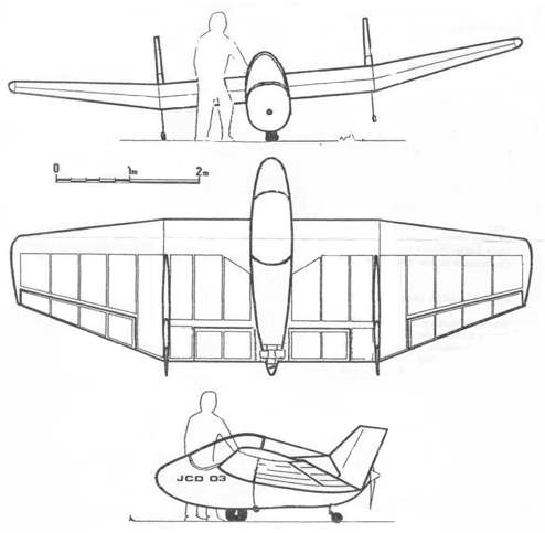 He came to the idea of a small flying wing. His first guess was a wing area of 12 m2 with a airfoil of 17% thickness instead of the usual 12%. The articles calculations did lead to a aspect ratio of 4 and resulted in a span of only 7,3 m. He made his prototype in wood. It became the JCD-02 "Pelican".